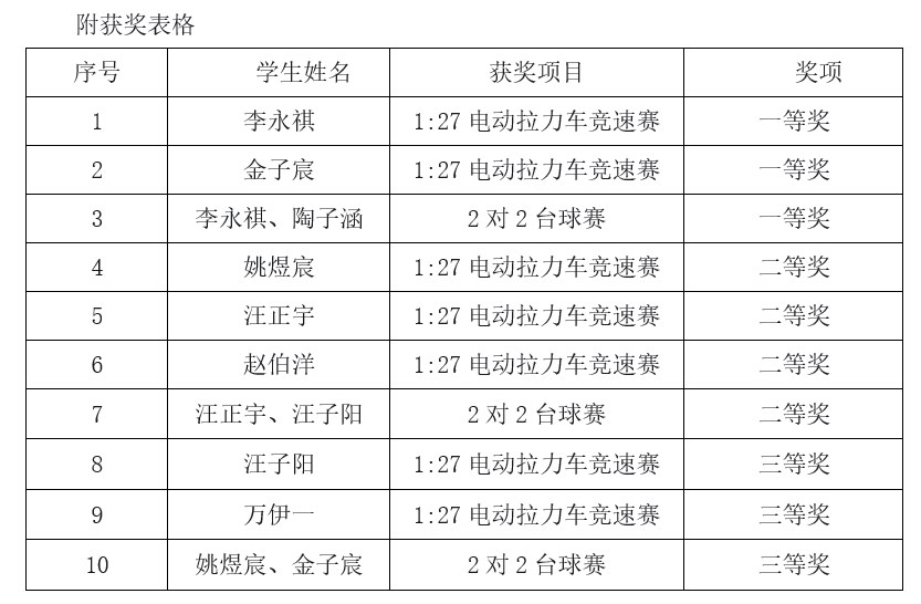 在此,学校向所有获奖同学表示最热烈的祝贺!向为此次比赛付出辛勤汗水、给予指导教师表示衷心的感谢!同时,也向全力支持孩子参与科技体育活动、配合赛事各项要求的家长们致以诚挚的谢意!