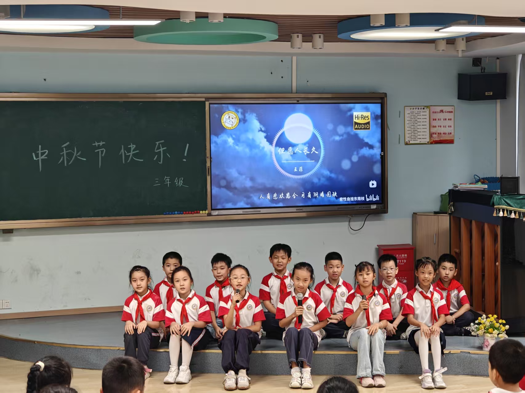 活动以“忆往昔·家国情”“唱家国·展风采”“看家国·好河山”三大板块为核心,打造沉浸式体验。在主题班队会上,各班级通过9.3阅兵片段、中秋民俗纪录片、“嫦娥奔月”传说分享等形式,带领学生回顾祖国76年发展历程,了解中秋民俗内涵,不少学生还主动讲述“我家的双节记忆”,传递家庭与国家的情感联结;学生集体创作“热爱祖国 梦绘华章”主题作品,全校学生则在美术课上动手制作爱国书签、祝福卡片与泥塑月饼,用创意表达对祖国与传统节日的祝福。