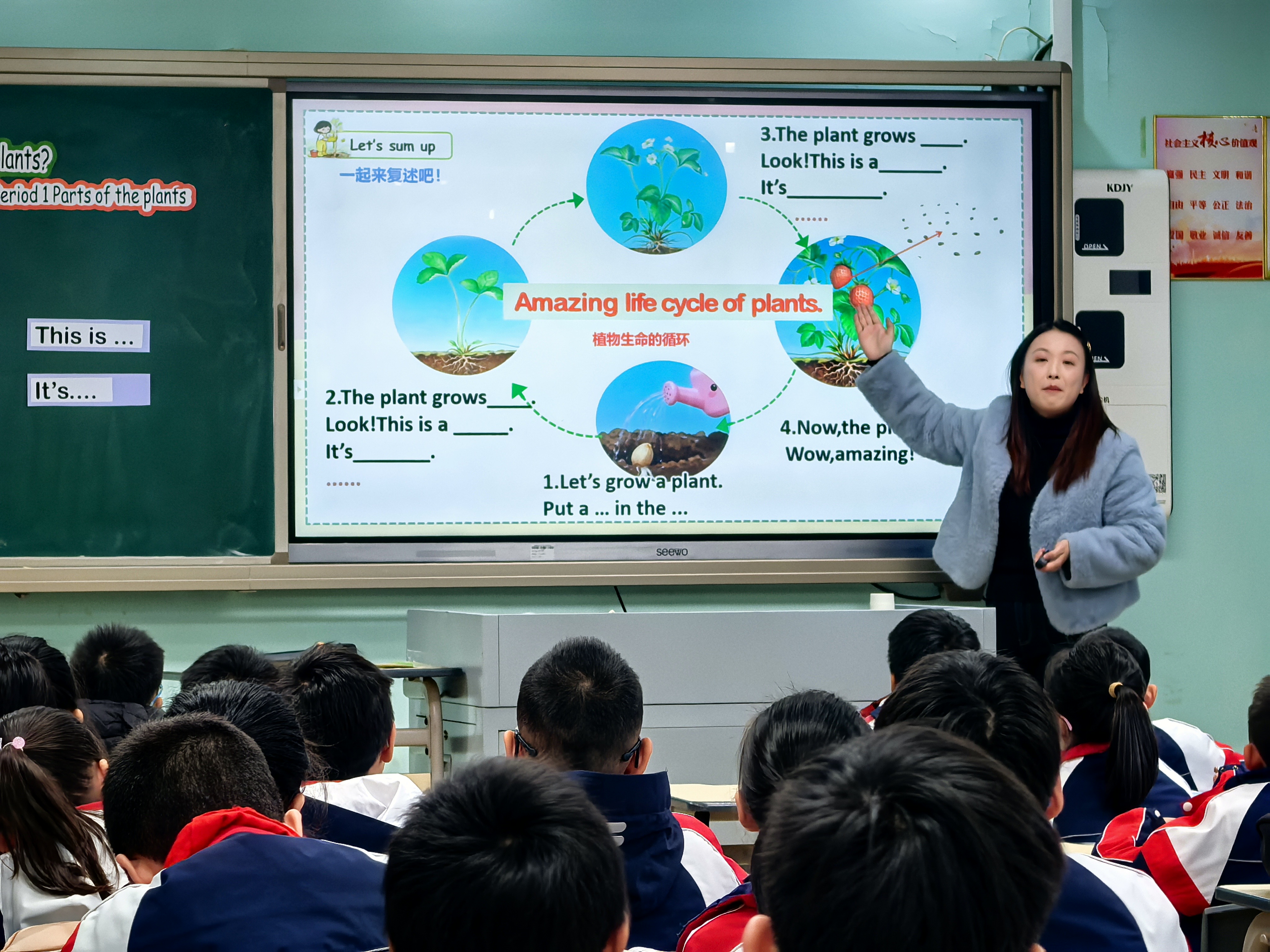 第一节课由文昌西路校区的苏婷婷老师执教Period 1 Parts of the plants。整节课苏老师设计了丰富的教学活动。在扮演果实的情境里,学生们大胆展现自我,积极表达;在Retell环节,学生们跟着老师的指令边做动作边表达,参与度拉满。Chant环节更是让学生在欢快的韵律中巩固了知识点。课堂最后,苏老师带着学生们一起梳理植物果实、种子孕育新植株的循环过程,让学生在掌握英语知识的同时,领略到植物生长的神奇。整节课,学生始终以饱满的热情参与活动,于观察、思考与互动中扎实掌握了语言知识,展现出优异的学习与探索能力。