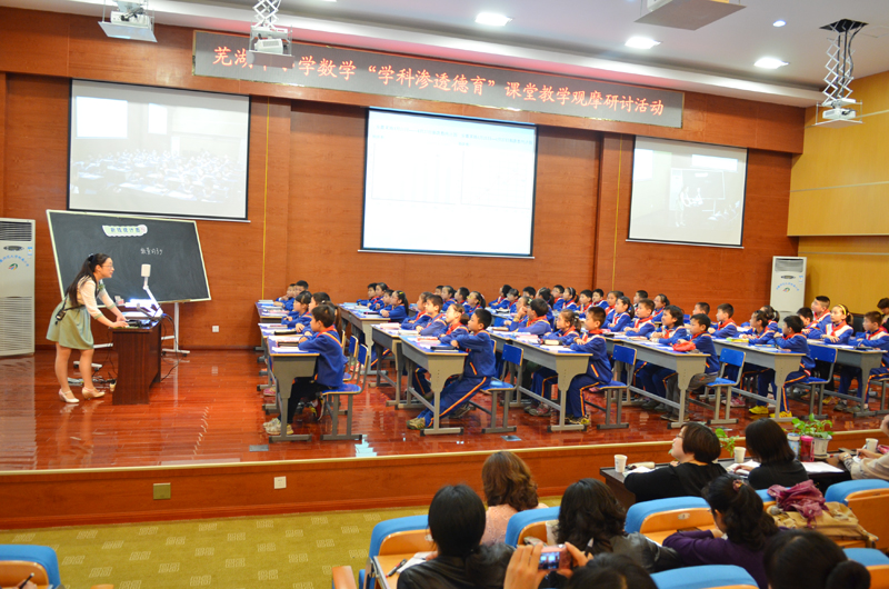 5月9日上午,芜湖市小学数学教研组的老师们冒雨到安师大附小进行教研,虽然距市区遥远,但仍然阻挡不了老师们的教研热情,前来参加教研活动的老师近两百人。此次教研的主题是小学数学“学科渗透德育”课堂教学观摩研讨,学校把活动安排在一楼多功能报告厅,首次使用数字化录播室,将教学现场的教师、演示课件等信息融合在一起,,给听课教师全方位的展示课堂情景,收到了很好的教学效果。
