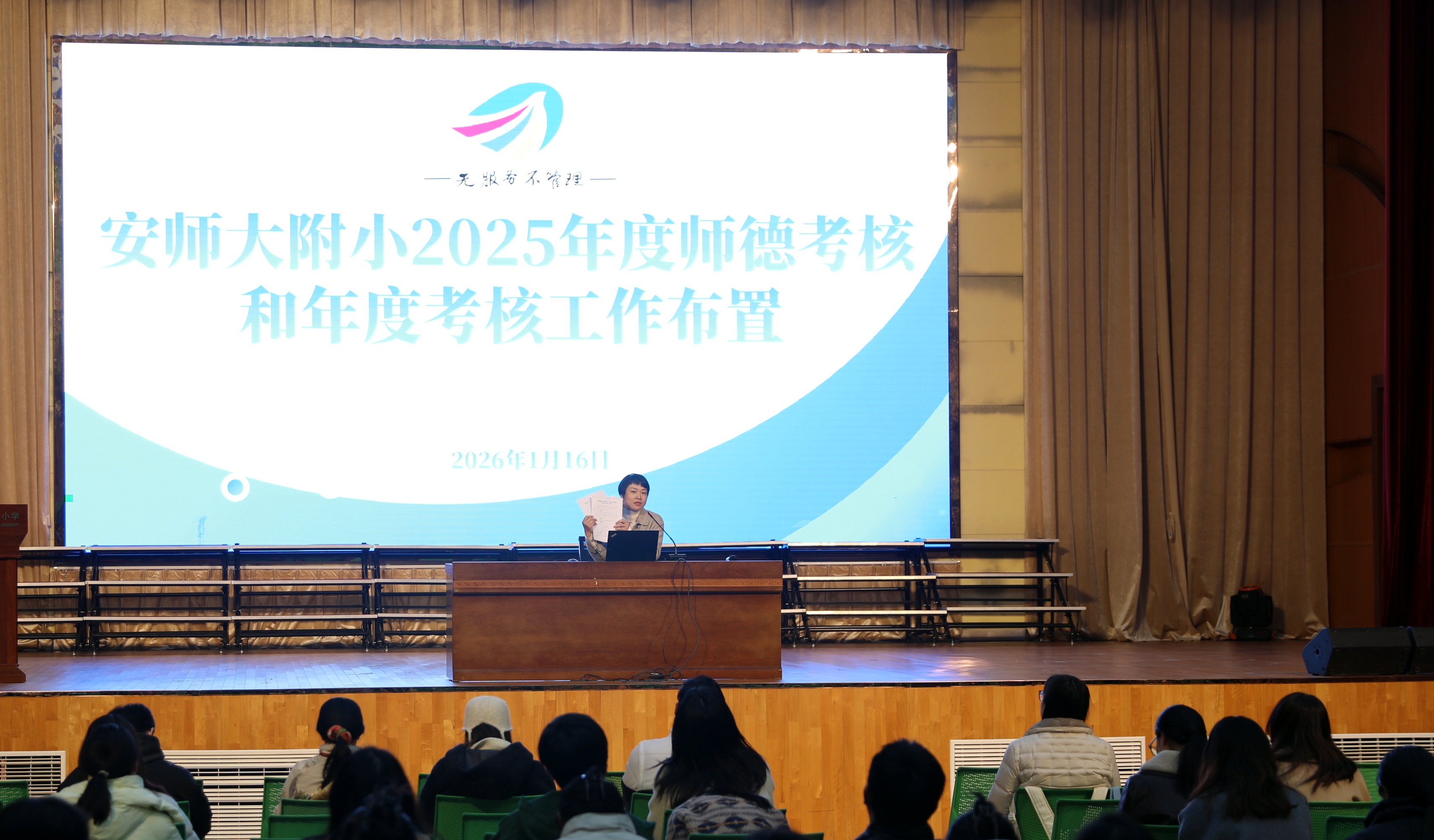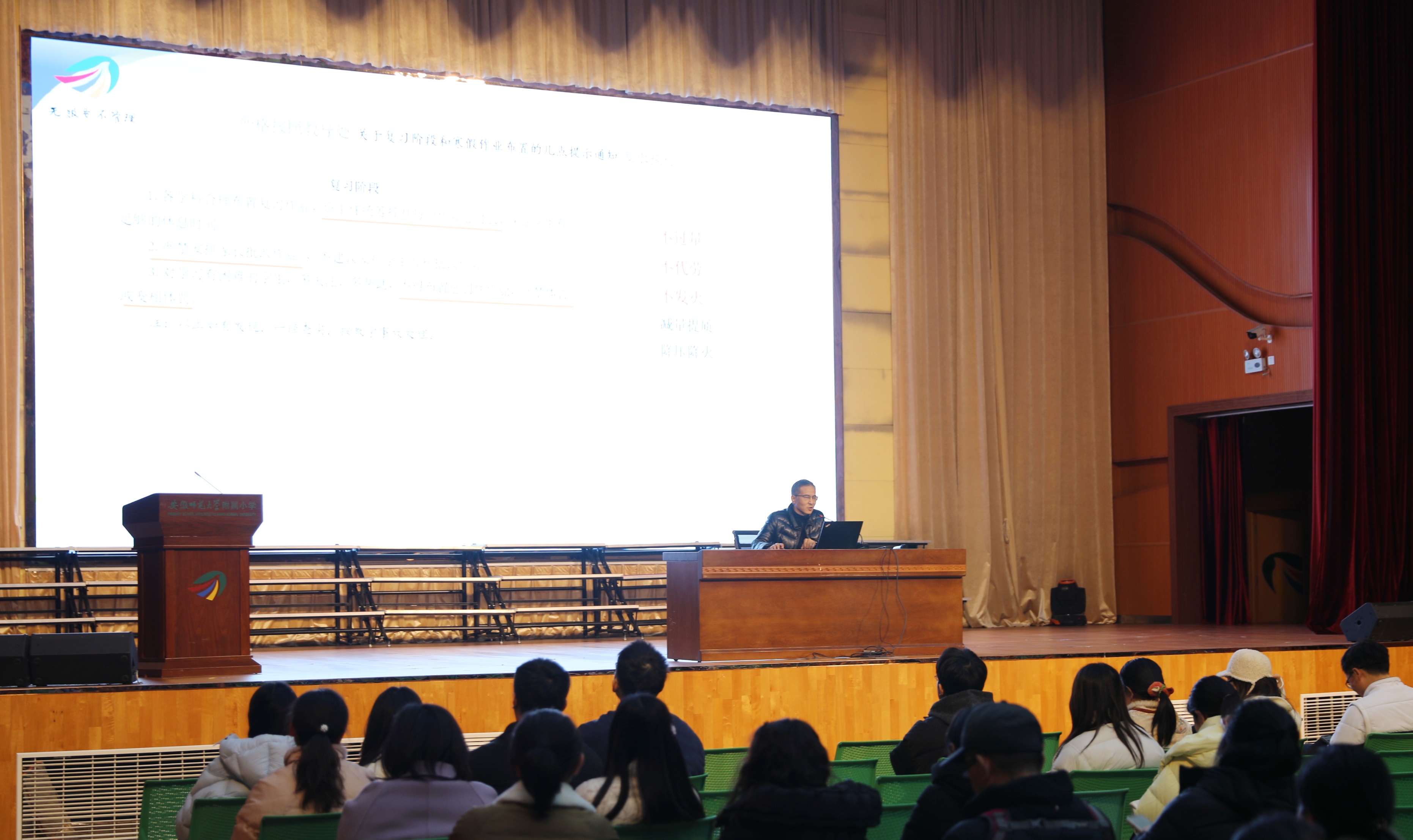 期末工作部署会上,副校长赵耀对近期教学工作、期末考试及寒假作业等工作做出布置,他强调,全体教师在复习阶段应继续坚守 “提质减量” 原则,轻负高效开展教学,聚焦学生综合素养提升,规范教学行为,科学设计寒假作业,保障学生自主成长空间。副校长宋玲布置了2025年度师德考核、年度考核及年终绩效等工作,并指出,师德考核、年度考核工作将结合岗位特点分组实施,确保考核公平公正。绩效分配与考核结果精准衔接,各行政部门将以精细化服务保障教职工正当权益,激发教职工履职担当的奋进活力。