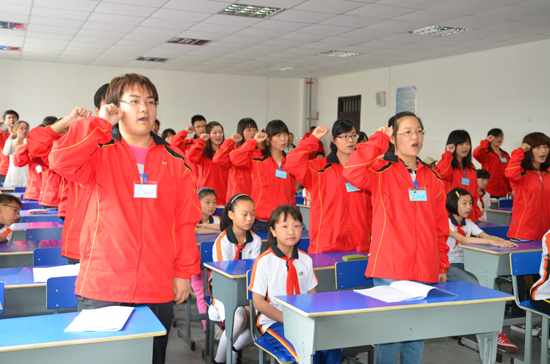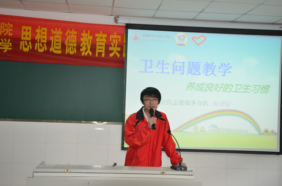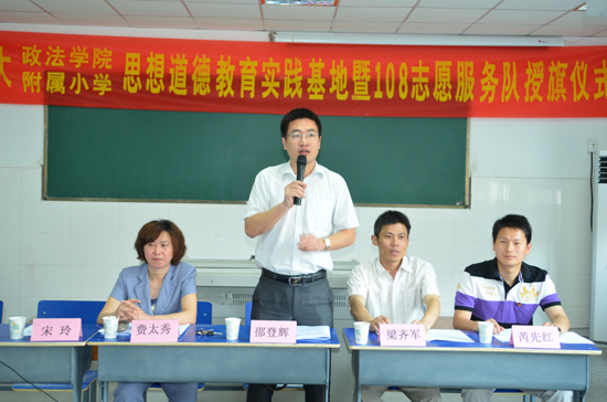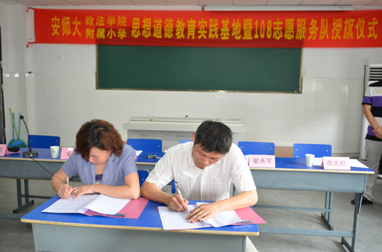 5月8日上午,安徽师范大学附属小学与政法学院未成年人思想道德教育实践基地暨108志愿服务队授旗仪式在师大附小多媒体教室举行。安徽师范大学校团委常务副书记邵登辉、师大附小党支部书记费太秀、政法学院党委副书记梁齐军、院团委副书记芮先红参加。仪式由师大附小教导处副主任宋玲主持。 费太秀代表师大附小对政法学院建立未成年人思想道德教育实践基地表示欢迎和感谢,并肯定了基地建设的积极意义。她表示会本着相互合作、共同成长的原则与政法学院一起更好的开展这项工作。随后,志愿者代表10政教陈玮亚发言并带领志愿者宣誓。梁齐军,费太秀代表双方签约。双方领导为分别向四个志愿分队负责人授旗。 仪式最后邵登辉做指导发言,认为思想道德教育对于小学生和大学生同样重要。政法学院成立108志愿服务队是传承学院108位学生10年志愿帮助朱麟洁的光荣,更是学雷锋常态化的重要举措。他指出没有爱的教育不是真的教育,没有爱的志愿活动不是真的志愿活动,希望大家用情呵护好服务对象,用智设计好服务内容,用心开展好服务活动。 仪式结束后“七彩课堂”志愿服务队为五年级学生开展了一次《爱卫生从我做起》的主题教育观摩活动,现场小学生认真听课、积极互动,在快乐的氛围中接受了教育。每年附小会有近2000名小学生接受相关主题的教育活动。
