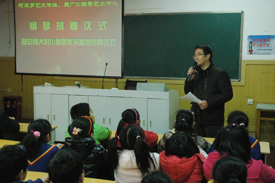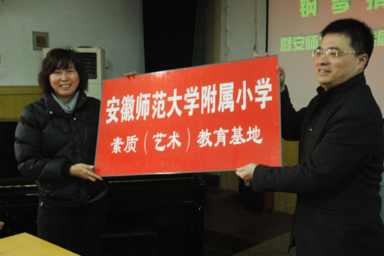 3月9日,芜湖阿波罗艺术传媒、周广仁钢琴艺术中心向我校赠送了一架精美高档的钢琴,捐赠仪式在我校多媒体教室举行。校长郁培林先生和芜湖阿波罗艺术传媒、周广仁钢琴艺术中心芜湖分部的艺术总监孙艺辉先生共同为捐赠的钢琴揭幕,校党支部书记费太秀不仅代表全校师生向芜湖阿波罗艺术传媒、周广仁钢琴艺术中心表示了最诚挚的谢意,而且还代表学校为“安师大附小素质教育基地” 挂牌。从即日起,芜湖阿波罗艺术传媒、周广仁钢琴艺术中心正式成为我校的素质教育基地。