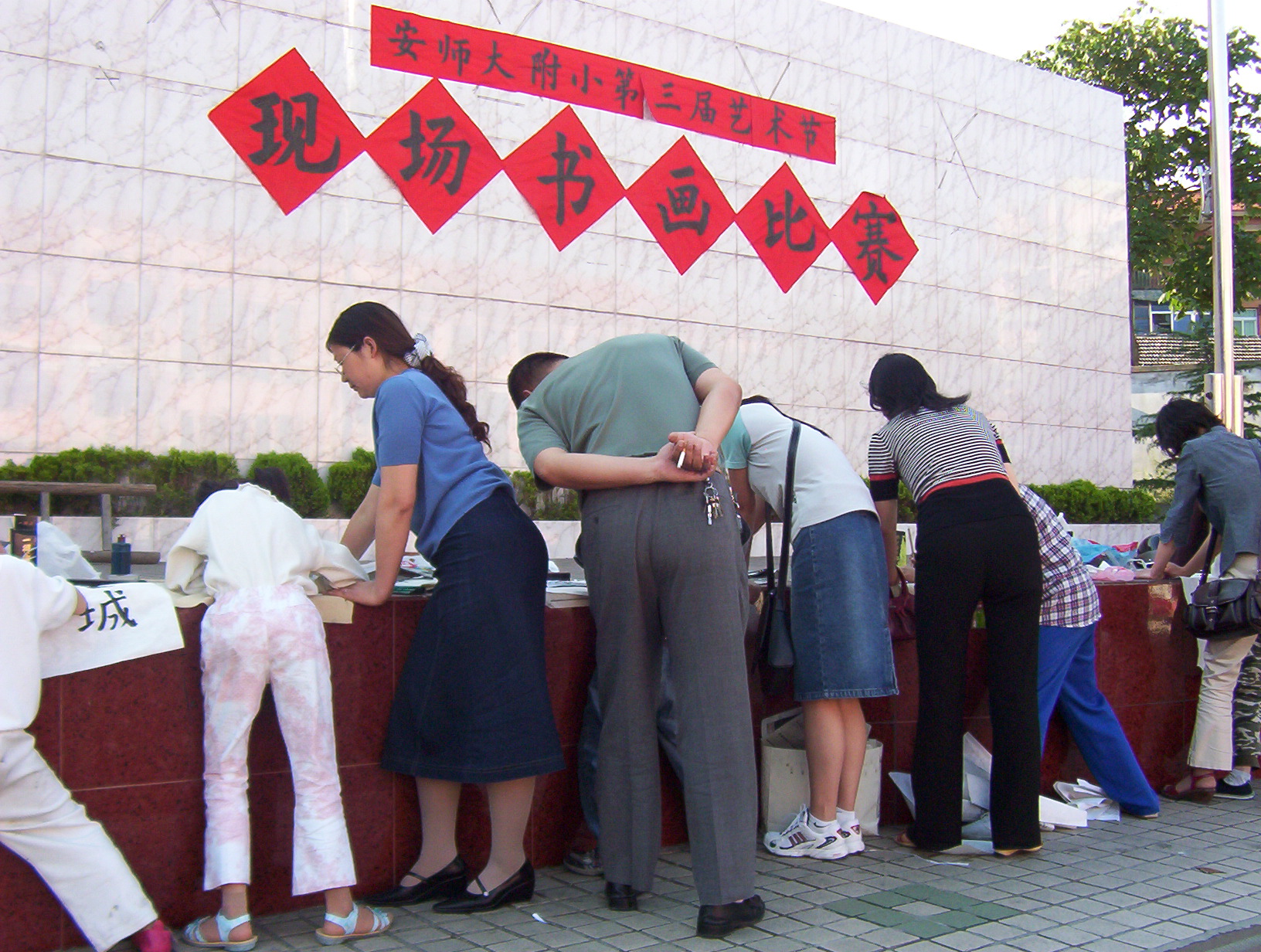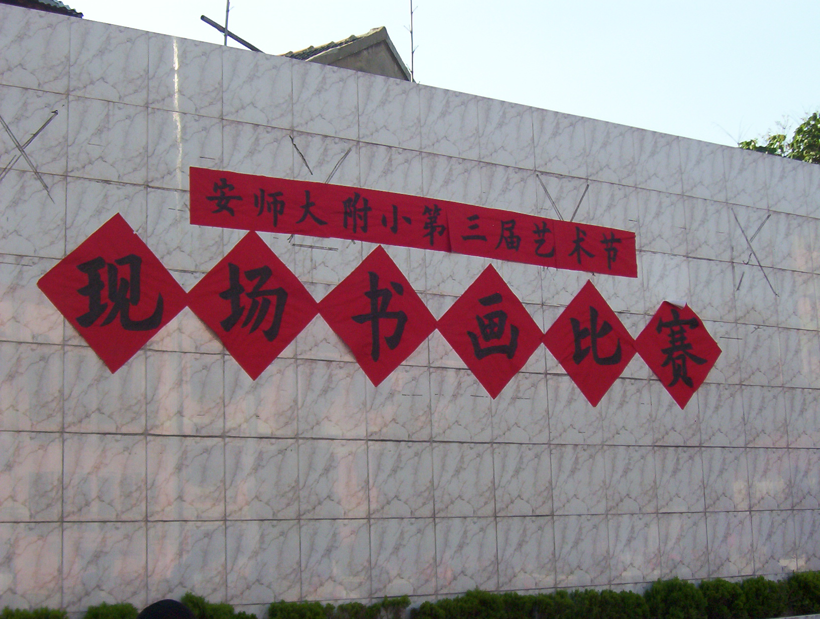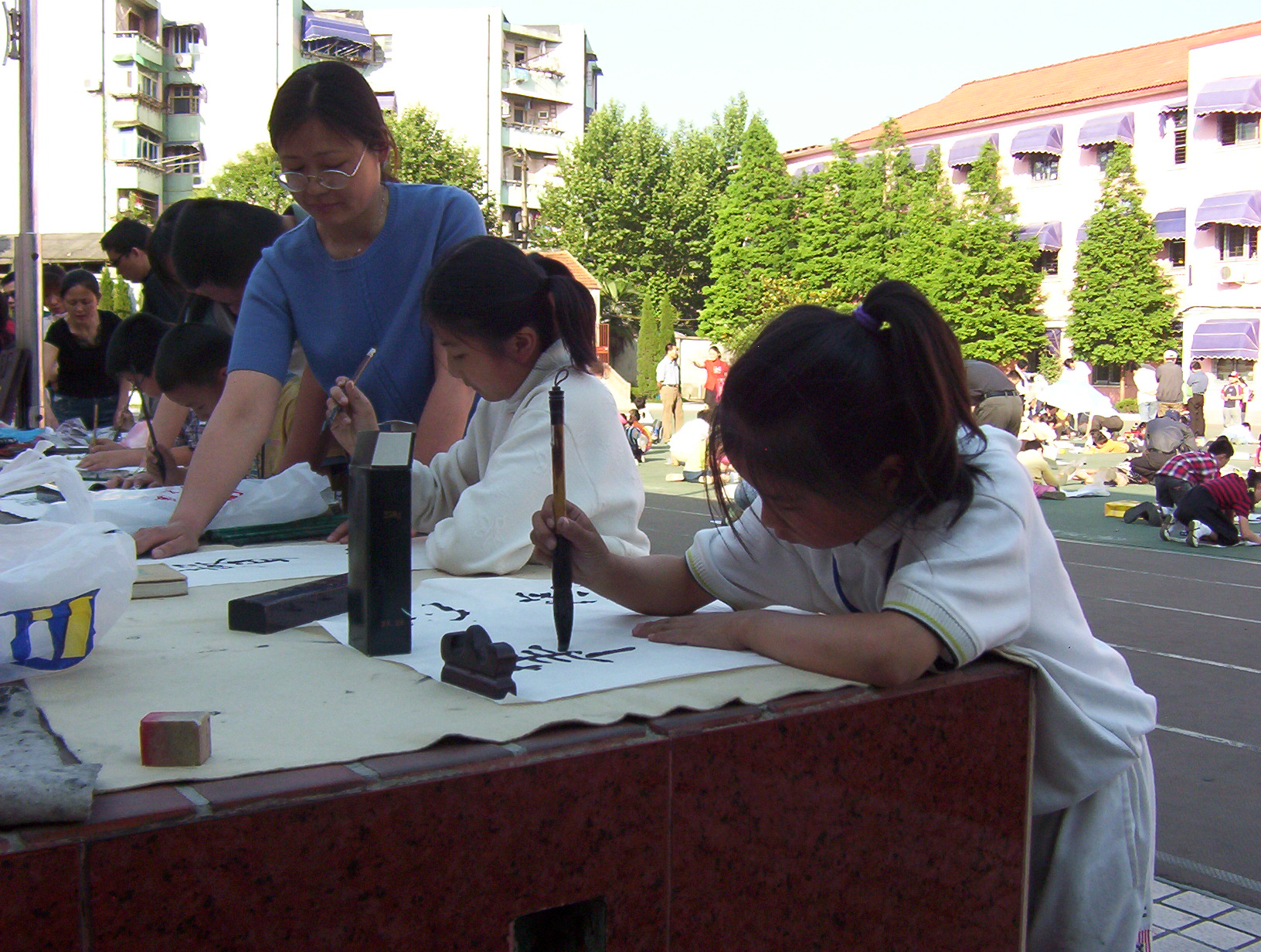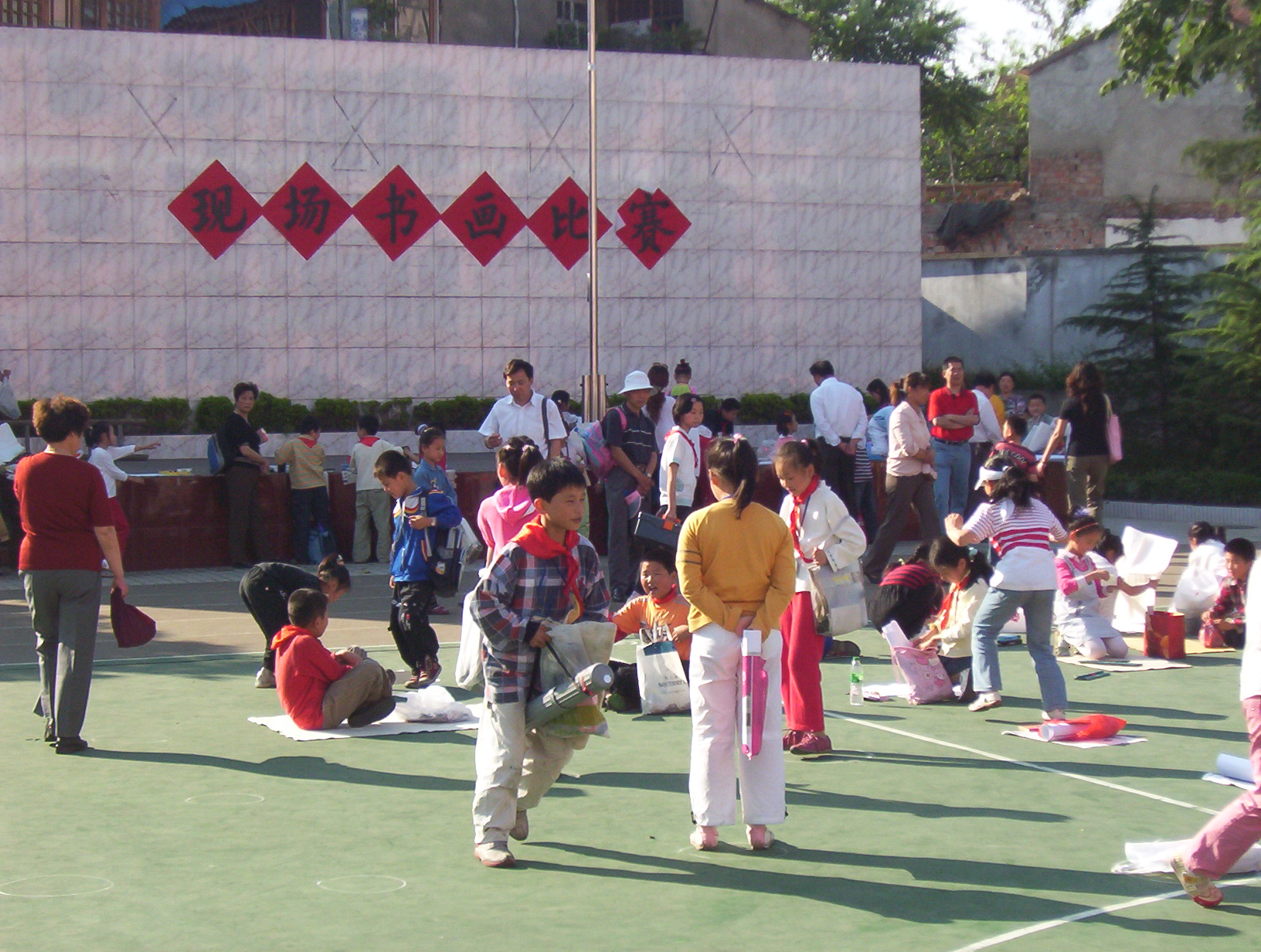 5月24日下午我校举办了2005年艺术节“书画现场比赛”活动。本次活动以 “爱家乡,爱学校” 为主题。在比赛现场,各班参赛选手在学校操场上自由发挥,有的作品刚劲有力,有的作品刚柔并兼,似有大家风范。下面就是书法比赛的现场: