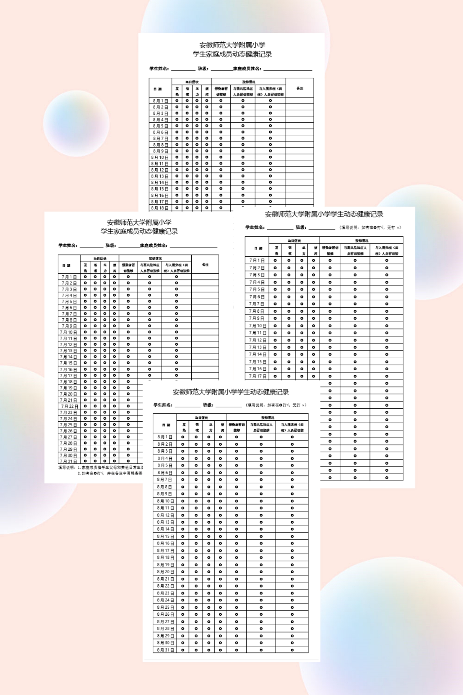 (1)各位家长要持续关注重点地区发布的确诊病例行动轨迹,居家期间坚持每天身体健康监测,关注学生及与其共同居住的家庭成员的身体状况和密接情况,认真填写《学生动态健康记录表》和《学生家庭成员动态健康记录表》,严格执行“日报告”、“零报告”制度。