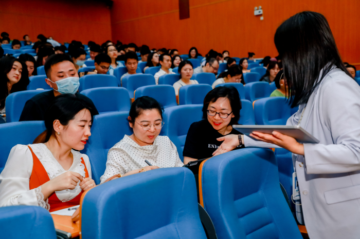 接下来由科大讯飞公司的翁鹏慧老师给大家做专题培训《畅言智慧课堂》。翁老师从常规课堂教学的困惑、课例展示、智慧课堂——教学新突破几方面内容,让大家对智慧课堂有了初步了解。部分教师还现场试用设备,模拟课堂情境,进行实际运用。
