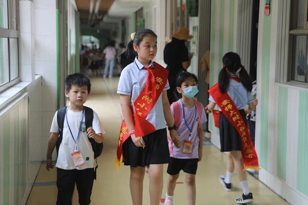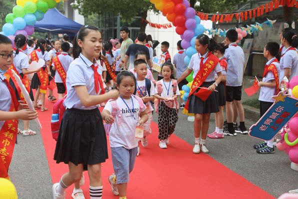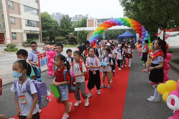 上午8:10,一年级新生陆续走进校园,踏上红毯,走过象征开启智慧之门的“启智门”。整装列队的红领巾志愿者们热情地指引着新同学走到相应班级门口,早已等候在班级门口的正副班主任微笑着迎接新同学,并和孩子们集体合影。
