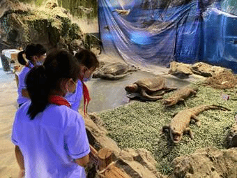 首先参观的是浸制标本馆。孩子们在迈进标本馆的一刹那,眼睛一下子亮起来。浸制标本馆内所有的标本都是浸泡在一些形状各异的瓶瓶罐罐里。一进馆内,就看到两只大玻璃容器里面装着白鳍豚标本,其中一只还露出了锋利的牙齿。往里走是各种蛙类和蛇类标本,看着解剖过的蛙类标本,同学们的神情由惊叹到紧张,在老师专业的讲解后,又不禁感叹生命的神奇。
