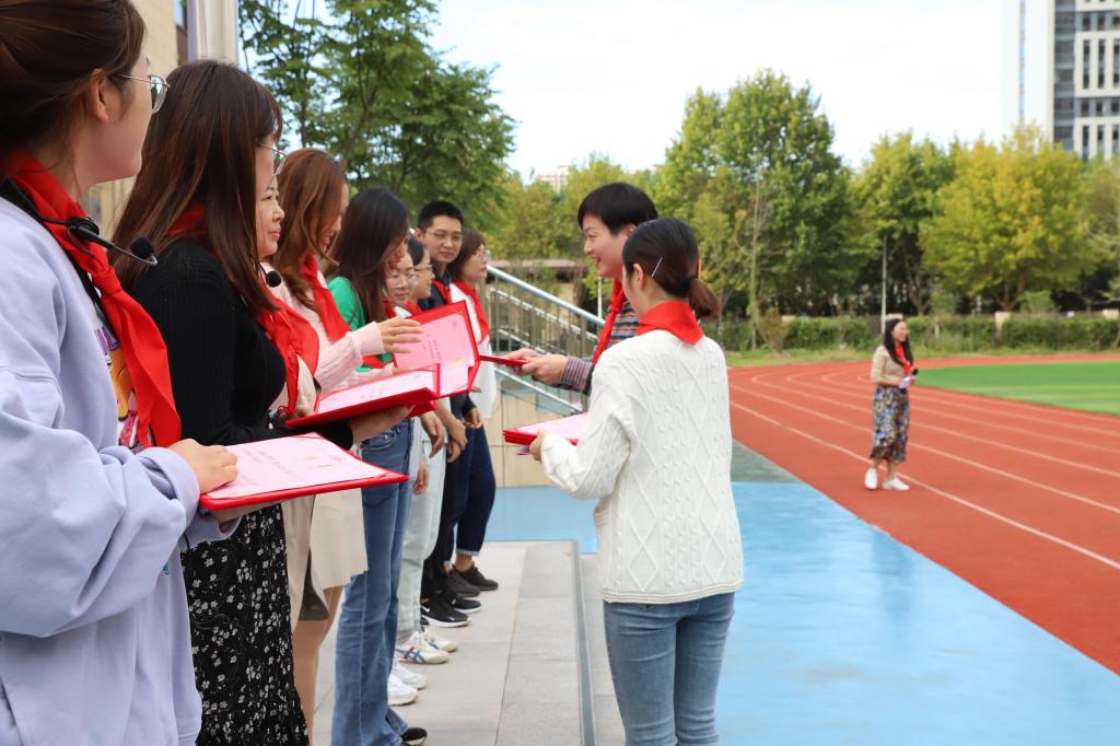 宋校长和徐主任为新晋大队干部们佩戴大队委队干标志