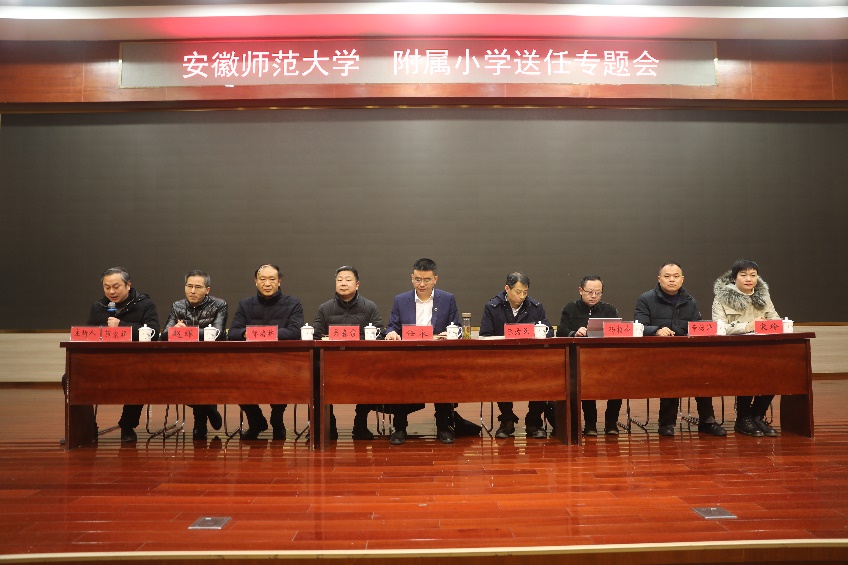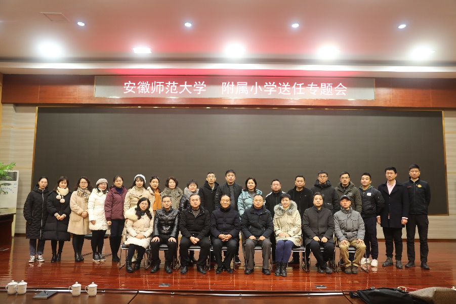 根据安徽师范大学党委安排, 1月24日上午9:00,安徽师范大学在附属小学多媒体报告厅召开附属小学新任领导送任专题会。出席会议的有安徽师范大学党委常委、副校长任永,组织部常务副部长朱为民,纪委副书记、纪委办主任吴春雷,人事处处长杨柏岭,附小党委委员、书记、校长辛治洋,师大教育发展(集团)有限公司董事郁培林等。附小(小教集团)领导班子全体成员、中层副职以上管理人员、党支部书记和委员、教代会执委、年级组长等参加会议。会议由附小党委委员、副校长茆家祥同志主持。