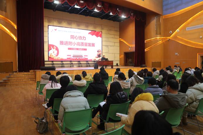 辛治洋书记做了题为《同心协力 推进附小高质量发展》的党课报告。辛书记从“新时代赋予新使命”“新使命开启新征程” “新征程要有新作为”三个方面进行了阐述。辛书记公布了新一届附小领导班子分工,指出新一届班子要以党的政治建设为统领,坚持和加强党的全面领导,完善各项规章制度,强化各项制度的执行,聚焦主责主业,引领教研风气,提升后勤服务和综合保障能力。辛书记强调,全体教师要承担起“为党育人,为国育才”的历史使命,肩负起时代赋予的教育重任,坚定不移贯彻执行党和国家的教育方针;要不断加强学习,在丰富自己专业知识的同时,不断增长通识性知识,进一步提升教科研能力,养成勤思考、善思考、乐思考的工作习惯,争取达到“研究即工作、工作即研究”的境界。