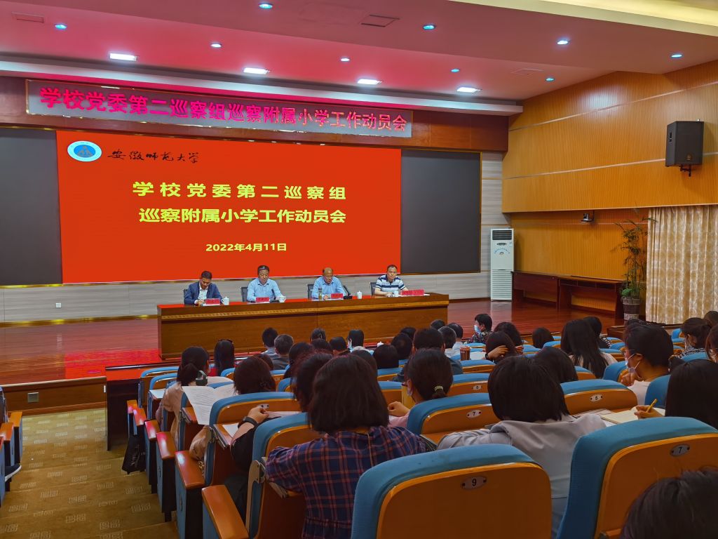 根据学校党委关于巡察工作的统一部署,2022年4月11日下午,安徽师范大学党委第二巡察组在附属小学召开巡察工作动员会。会前,校纪委副书记、第二巡察组组长吴春雷主持召开与附属小学党委书记、校长辛治洋的见面沟通会,传达了学校党委书记胡朝荣同志在学校党委常委会上听取巡察有关工作汇报时的讲话精神,通报了有关工作安排。会上,校党委常委、纪委书记、监察专员、巡察工作领导小组副组长周新发作了讲话,对做好巡察工作提出了要求。辛治洋主持会议并作表态讲话。