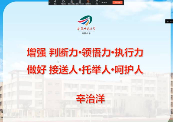 最后,校党委书记、校长辛治洋带领大家学习了中共中央办公厅印发的《关于推动党史学习教育常态化长效化的意见》,并结合疫情阶段学校具体工作做了题为“增强判断力·领悟力·执行力,做好接送人·托举人·呵护人”的讲话。辛校长强调指出,当前疫情特殊时期,全体老师要明是非,增强判断力,把及时填报每日核酸检测报告、每日健康打卡、每周健康码和行程码当作当前一项重要的政治任务,全市上下一盘棋,一切行动听指挥;全体教师要增强领悟力,积极适应疫情阶段线上线下随时切换的新常态,主动接受和习惯使用钉钉平台,利用附小“家校共育”钉钉群开展各项工作;全体教师要增强执行力,疫情特殊时期,既要关注自我身心健康,呵护家人健康,更要主动关心爱护学生,做好学生成长路上的接送人·托举人·呵护人。