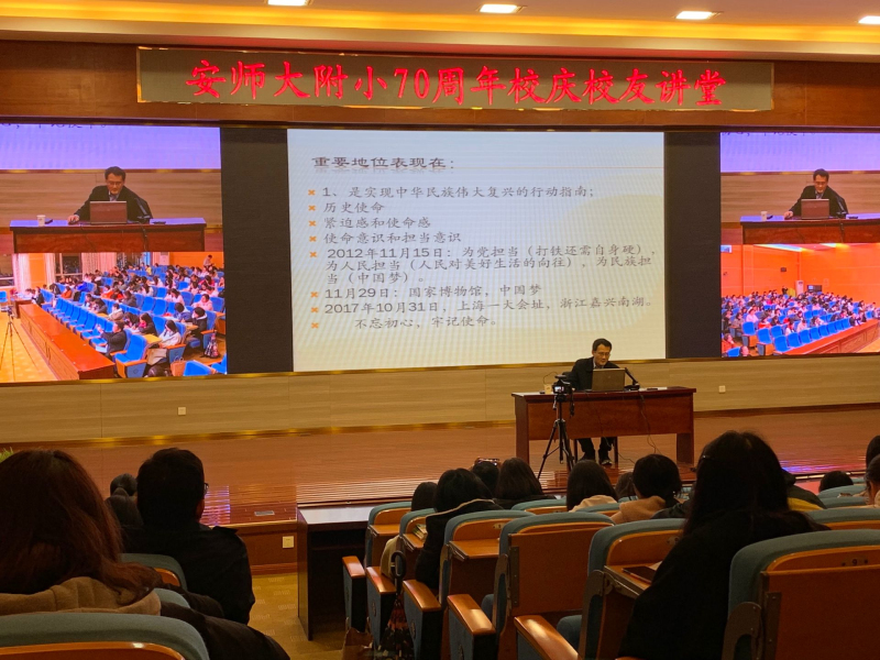 11月27日下午,安师大附小70周年校庆系列活动之“校友讲堂”在小报告厅进行。本次“校友讲堂”特别邀请附小85届校友、中央党校许韬教授主讲。参加此次学习的有附小全体教师和东西校区的党员教师,附小党总支秘书郑红同志主持了本次学习活动。