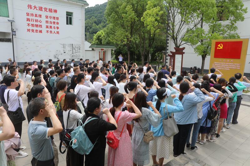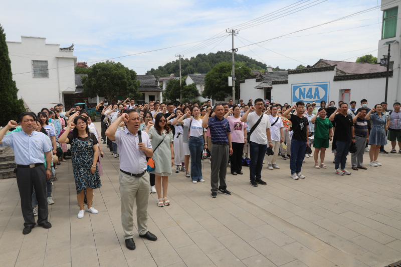 年新四军繁昌保卫战中,我军对日军五战五捷,现场的沙盘展示、历史图片、文献史料等让广大党员教师真切感受到新四军勇往直前、不畏牺牲的铁军精神。随后,我们跟随讲解员走在中分村的小路上,聆听了谭震林同志等革命先辈的故事,参观了谭震林同志等革命先辈们工作、生活和指挥战斗过的地方,故居中的一幕幕史料瞬间将我们带入了那个热血年代。接着,我们怀着满腔的热忱,开展了新党员入党宣誓、老党员重温入党誓词活动,入党积极分子和入党申请人列席观摩,在鲜红的党旗下,党员教师们庄严地举起右手,握拳宣誓,再一次表达对党忠诚、为党的事业奋斗终身的决心。