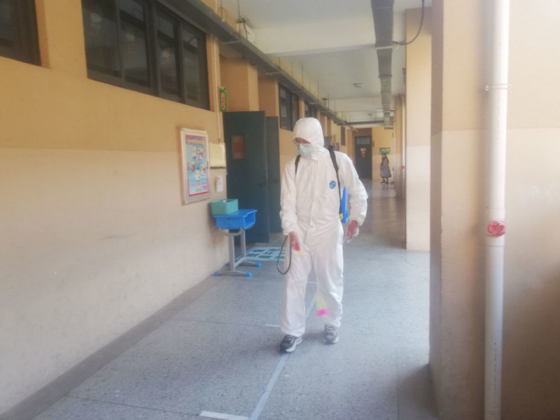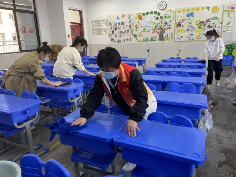 活动中,吴斌、宗远宝、丁杰三位老师严格按照操作规范进行喷洒消杀,其余党员老师齐心协力,互相配合,用抹布擦拭桌面、桌脚和椅背,不放过一处卫生死角。