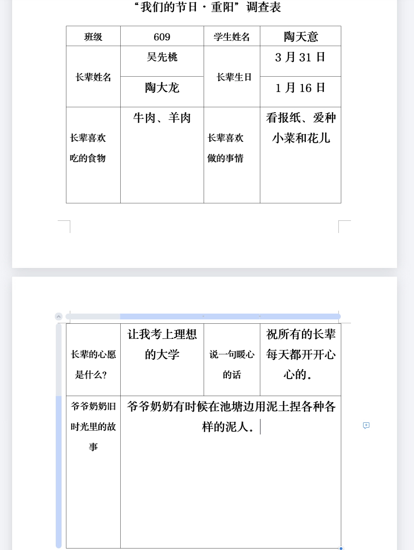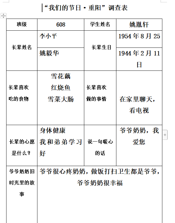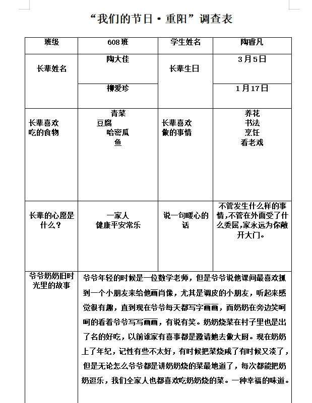 五、六年级的队员们开展了“重阳小调查”活动。他们通过调查表的形式,向长辈做了一次访谈,聆听长辈旧时光里的动人故事,少先队员们体会到长辈们的艰辛与不易,同时也心怀感恩。