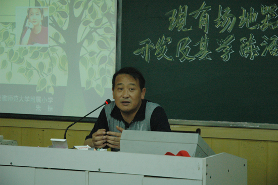 接着由安师大附小朱振老师做了主题为“关注学生的成长过程,为孩子的成长奠基”的专题校本教研汇报。汇报分为三个部分。第一部分介绍了安师大附小体育场地器材的基本现状与存在的困惑;第二部分介绍了安师大附小现有体育场地器材的多功能开发的有效尝试;第三部分介绍了安师大附小在现有体育场地器材多功能开发的三个典型案例(冬季长跑、中华传统挑战赛、《我是篮球传接小能手》课堂教学案例)。