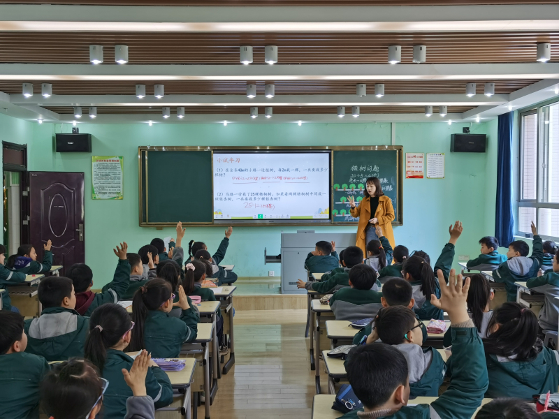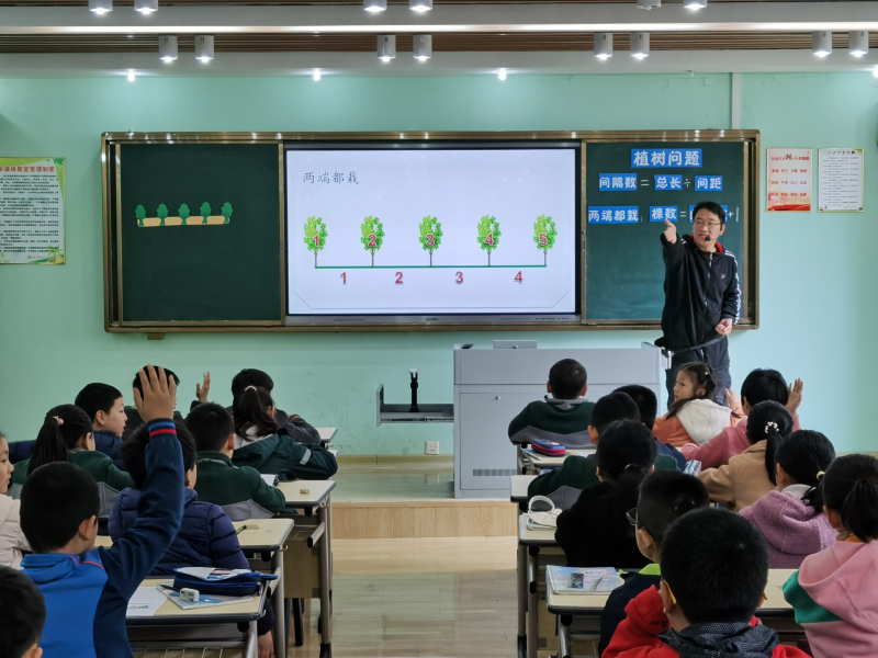 本次教研课题为人教版五年级上册《植树问题》,执教老师分别是安师大附小东校区杨新诚老师和安师大附小西校区王梦琴老师。两节课均在上学期举办的安师大小学教育集团数学青年教师生本课堂教学比赛中获特等奖,今天,两位教师又一次大胆改进创新,与四年级学生共同学习,同课异构,两节课精彩纷呈。