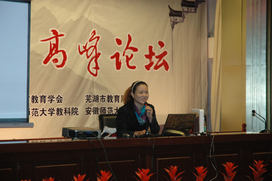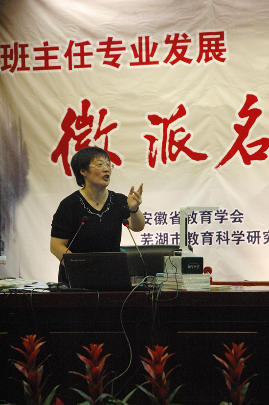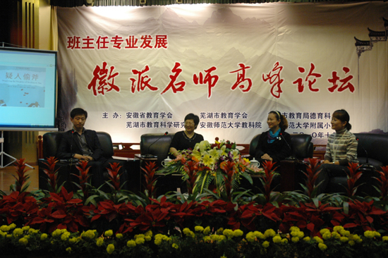 秋雨绵绵,丹桂飘香,2010年10月23日,由我校及安徽省教育学院、芜湖市教育局德育科、芜湖市教育科学研究所、安师大教育科学学院共同主办的“‘班主任专业发展’徽派名师高峰论坛”在镜湖区政府礼堂隆重开幕。安师大李琳琦副校长、市教育局王亚平副局长、省教育学院邓英达副会长、安师大教科院桑青松副院长、市教科所俞宏胜所长、市教育局德育科李惠玲科长等领导嘉宾出席了开幕式。我校郁培林校长、市教育局王局长、省教育学会邓会长、安师大李校长作了热情洋溢的发言,对会议的举办表达了祝贺和期待。本次论坛,来自全省各地中小学班主任、学校管理人员约五百人济济一堂,表现出对班主任专业发展这一新兴话题的热切关注。整个会议历时两天,内容丰富,主题鲜明。我校首席班主任宋玲老师的专题报告广受好评,著名教育家李镇西先生,我省全国知名班主任、语文教师薛瑞萍老师,也为论坛带来了前沿的思考和理念,给与会者积极的引领和深刻的启迪,反响热烈。此外,我们还邀请部分优秀班主任参与由师大教科院周兴国教授、薛瑞萍老师主持的论坛现场互动,交流形式之新、互动效果之好成为本次会议的一大亮点。(文/骆正位 图/刘琦)