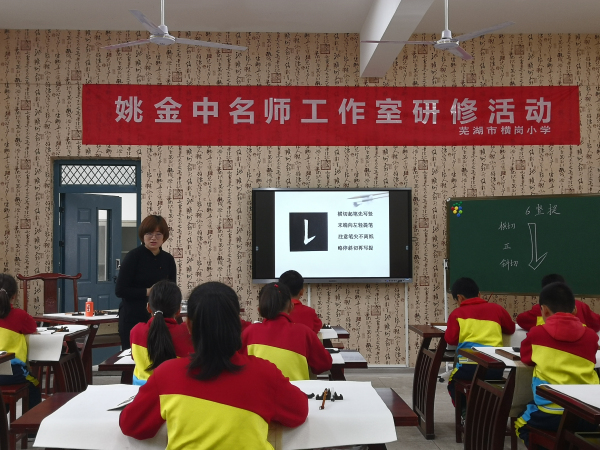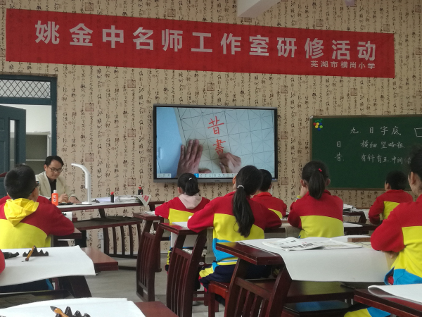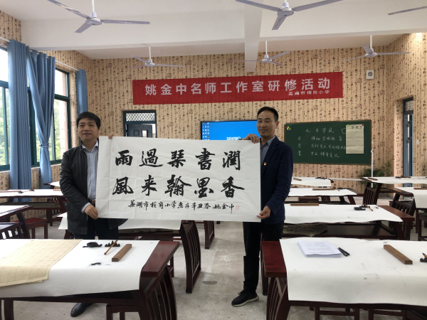 4月27日上午,芜湖市姚金中书法名师工作室部分成员赴芜湖市横岗小学开展研修活动。湾沚区教育局教研室主任汪全收、横岗小学校长陶小明以及部分区属骨干教师参与了此次活动。