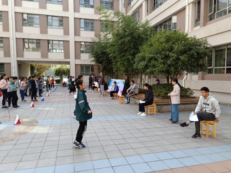 当比赛的哨声响起,操场上顿时呈现出一片欢腾的景象。一根根彩绳、一张张纯真的笑脸在灿烂的阳光下飞舞、绽放。每位队员都使出了浑身的解数,表现出了不凡的实力。顽强拼搏显身手,英姿飒爽展雄风,现场气氛无比高昂与欢腾,秋日的校园因一根根小小的跳绳而充满生趣。