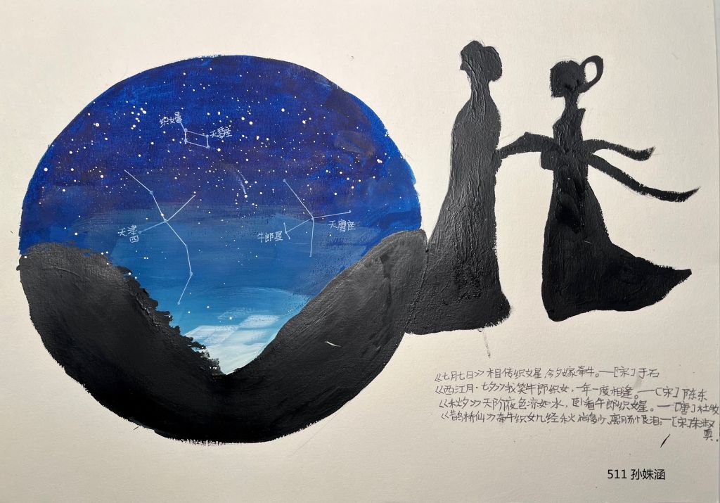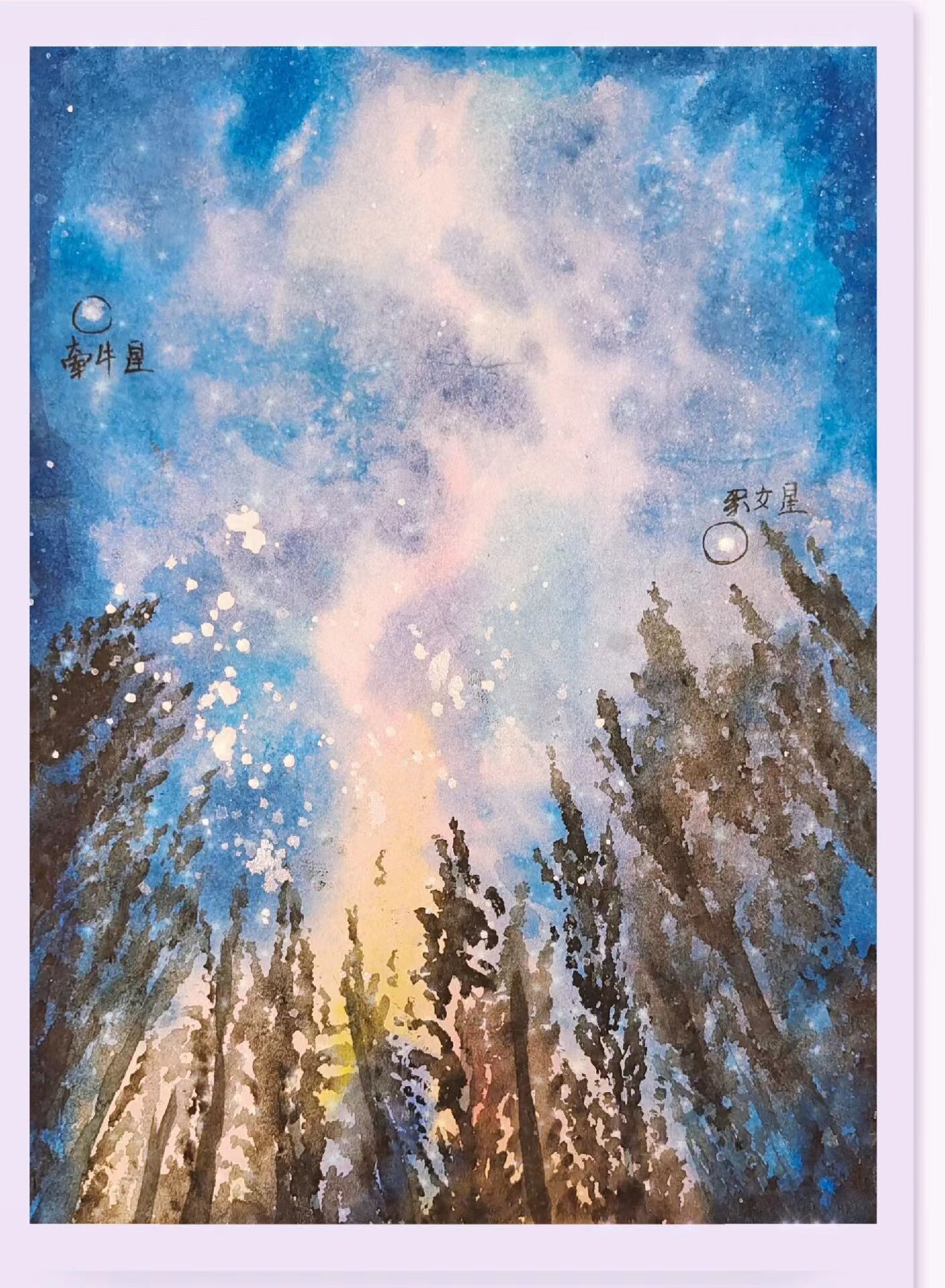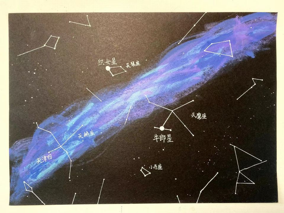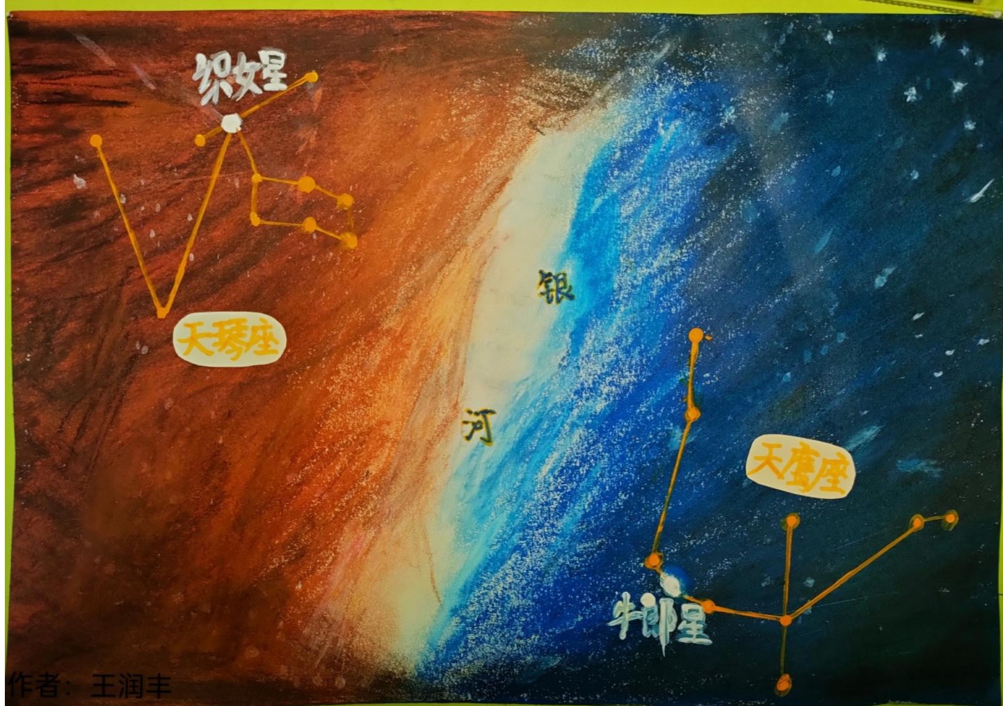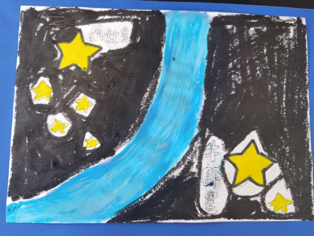 “七夕今宵看碧霄,牵牛织女渡河桥”。三、四年级的队员们在爸爸妈妈的指导下,七夕坐看牛郎织女星,观察夜空,认识牛郎织女星,并将所见星空画在纸上。