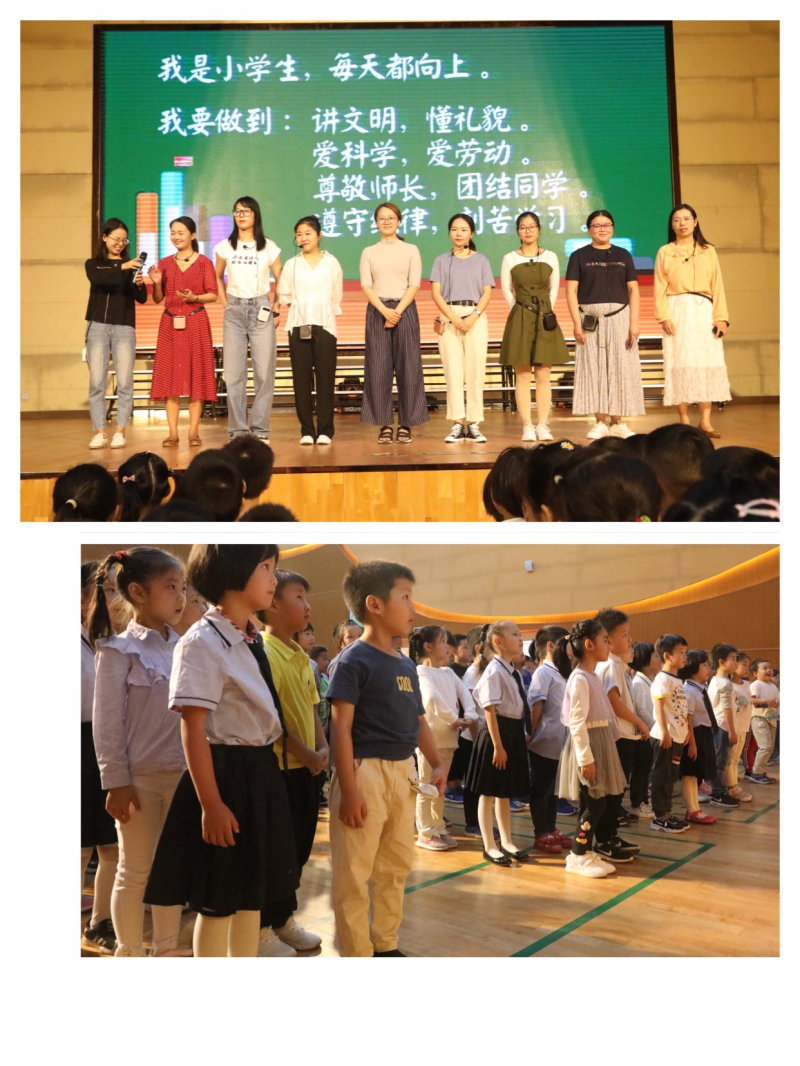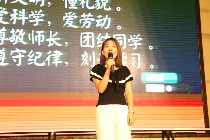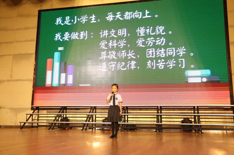 首先由一年级各班班主任老师登台为新同学带来新学期寄语,同时老师们也对同学们今后的学习生活提出了要求和希望,并祝愿孩子们健康快乐地长大,成长为“遵规守纪、诚实守信、自立自强”的好少年。