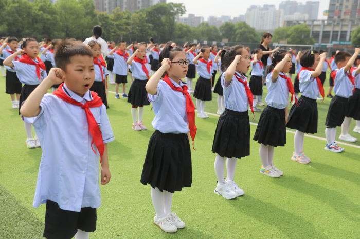 5月25日上午,安师大附小首批新队员入队仪式在学校操场隆重举行。入队仪式上共有154名学生被正式批准加入中国少年先锋队,成为光荣的少先队员。校少先队大队前期有效利用网络资源开展了队前教育,根据上级工作部署,改变以往全童同时入队的方式,综合“六知六会一做”知识考察、自评互评及他评等多方面评价,分批接受队员入队。