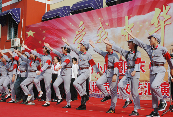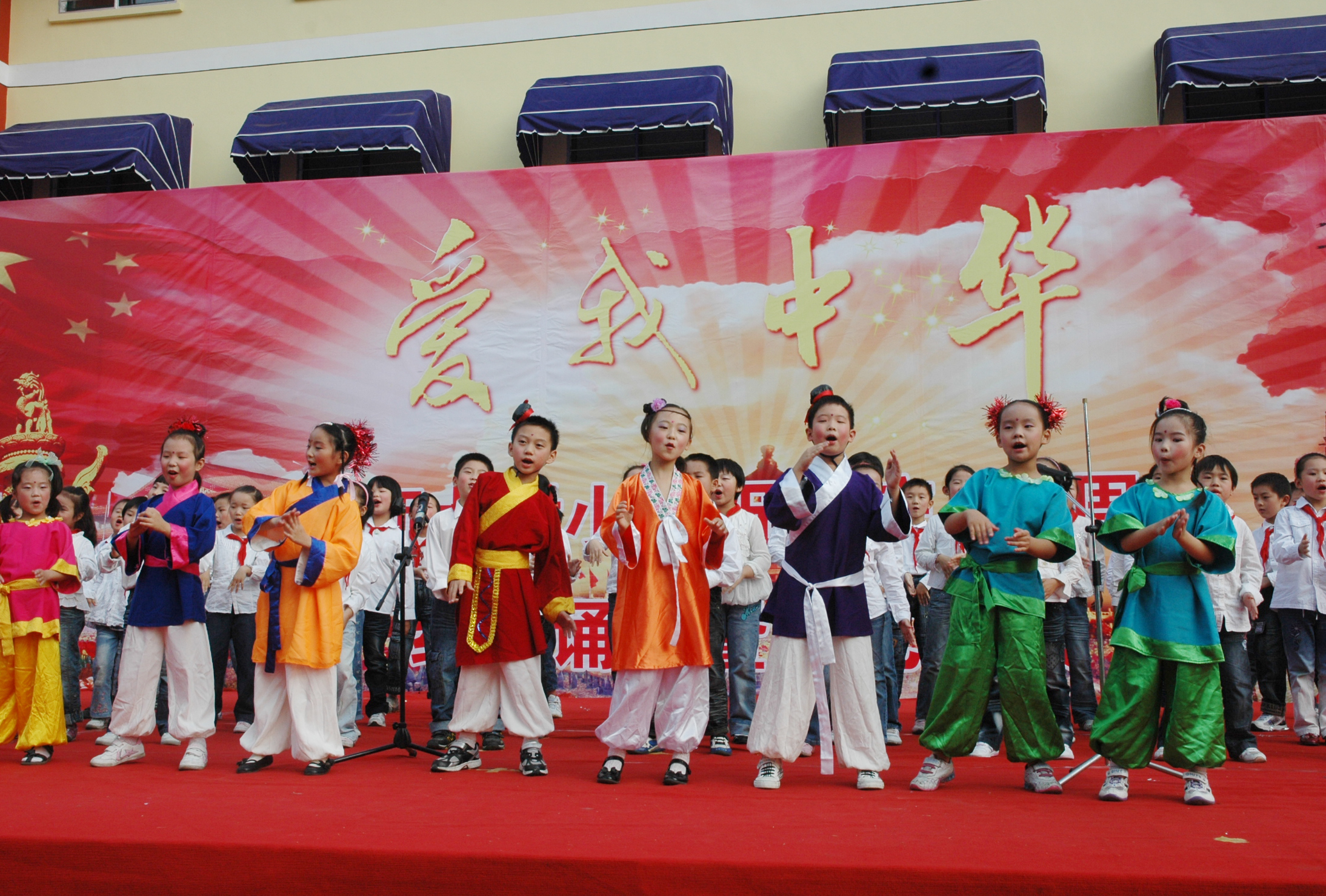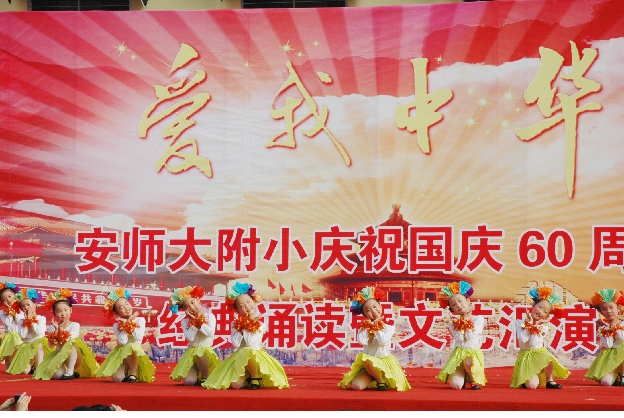 为了庆祝中华人民共和国成立60周年,歌颂我们伟大的祖国,也为了进一步推动我校经典导读实验的开展,丰富我校校园文化生活,我校于9月30日在校操场隆重举行了“爱我中华”庆祝中华人民共和国成立60周年经典诵读文艺汇演活动。