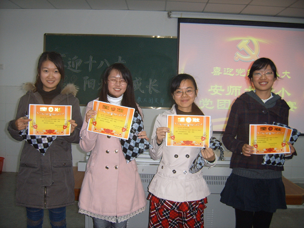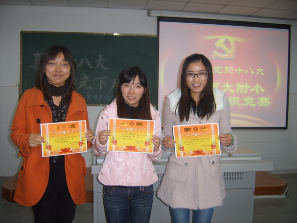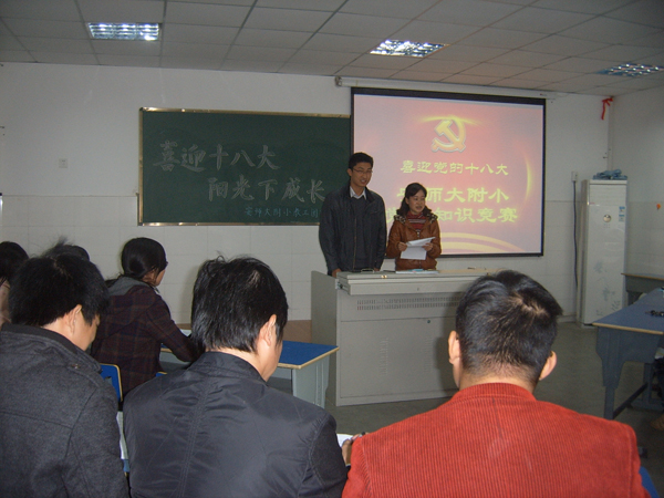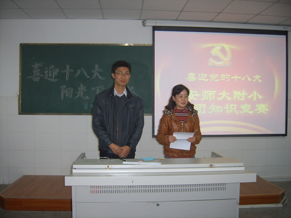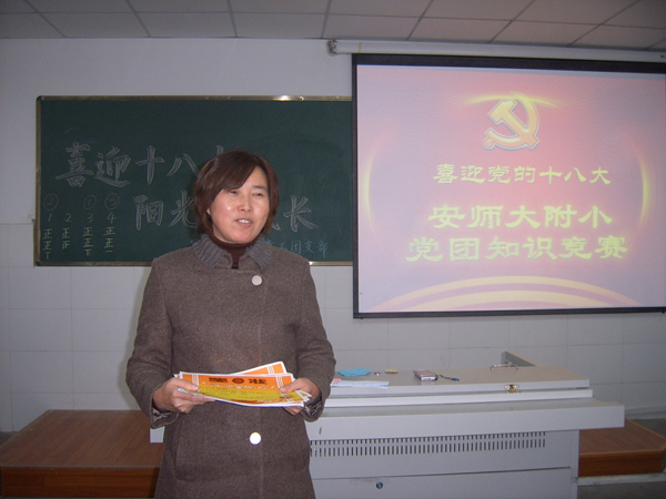 2012年11月13日,安师大附小教工团支部成功举办了“喜迎十八大阳光下成长”党团知识竞赛。组织本次活动,旨在进一步激发青年团员们创先争优、努力奋进的热情,进一步增强青年荣誉感和责任感,进一步发扬共青团员先锋模范作用,用实际行动为党的十八大献礼。