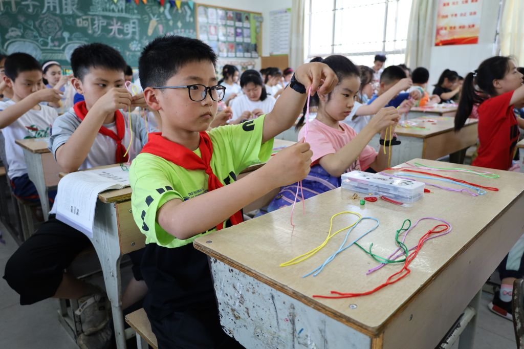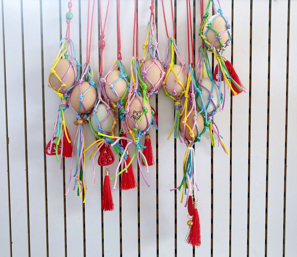五年级各中队队员编织五彩绳蛋兜。队员们互相协作,五彩绳在灵巧的双手间穿来穿去。不一会儿,一条条五彩绳蛋兜就编好了,浓浓的节日气氛充盈在教室中。