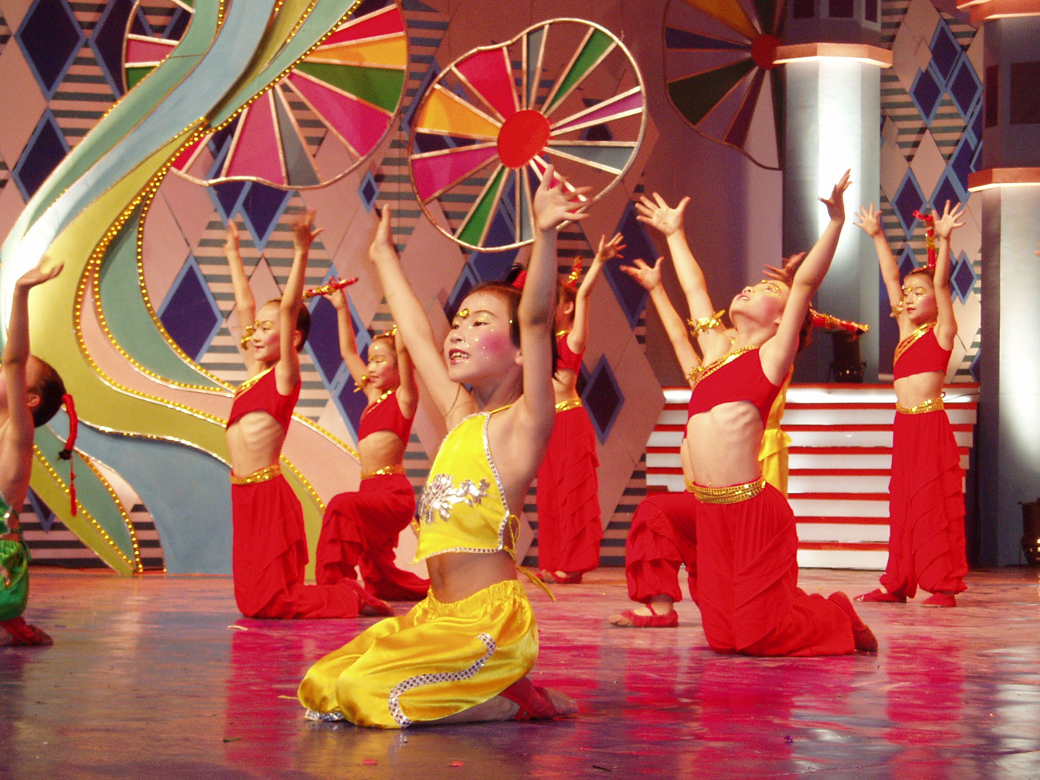 2005年5月29日我校学生的集体舞《龙子龙孙》参加《托起明天的太阳》安徽省六一儿童晚会录像,这次庆祝六一活动全省共有18个节目参加了录像,并且在六一儿童节当天中午由省电视台向全省播出。下面为我校学生现场表演瞬间: