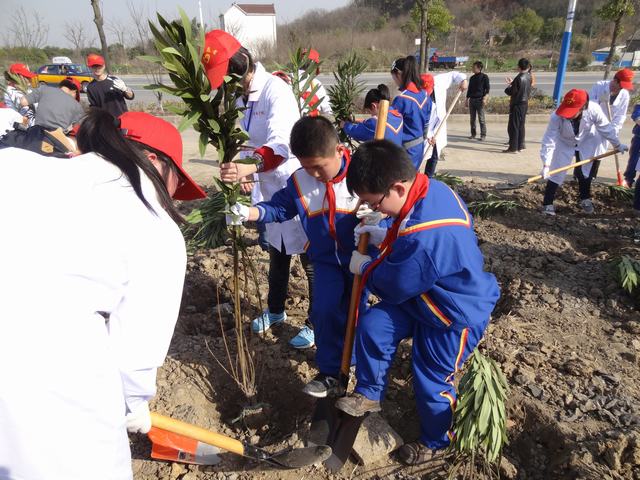 下午2点,我校15名学生与30名大学生、15名中学生一起来到弋江区白马山,在专业植树工作人员带领下,栽种近30棵树苗。