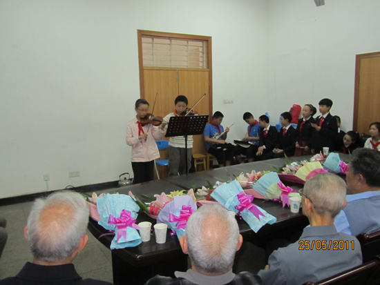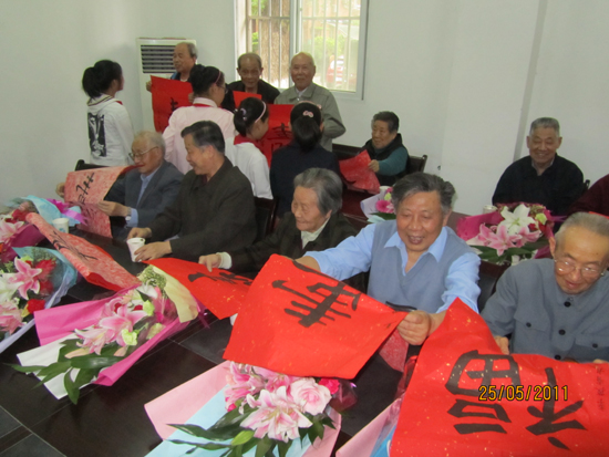 下午3时40分慰问活动正式开始,首先少先队员们向革命老前辈致以少先队队礼并献上鲜花,表达对革命前辈的崇高敬意和爱戴之情,接着表演诗朗诵、乐器演奏、小合唱等文艺节目。小朋友们的表演,态度认真,形式多样,内容寓意深刻,博得阵阵掌声。之后,少先队员们涌向老同志,赠送自己亲手书写的“寿”字、“福”字,表达他们对革命老前辈的衷心祝福,并祝他们“寿比南山,福如东海”,合家欢乐,晚年幸福。老同志们感动不已,大手和小手紧紧地握在一起。