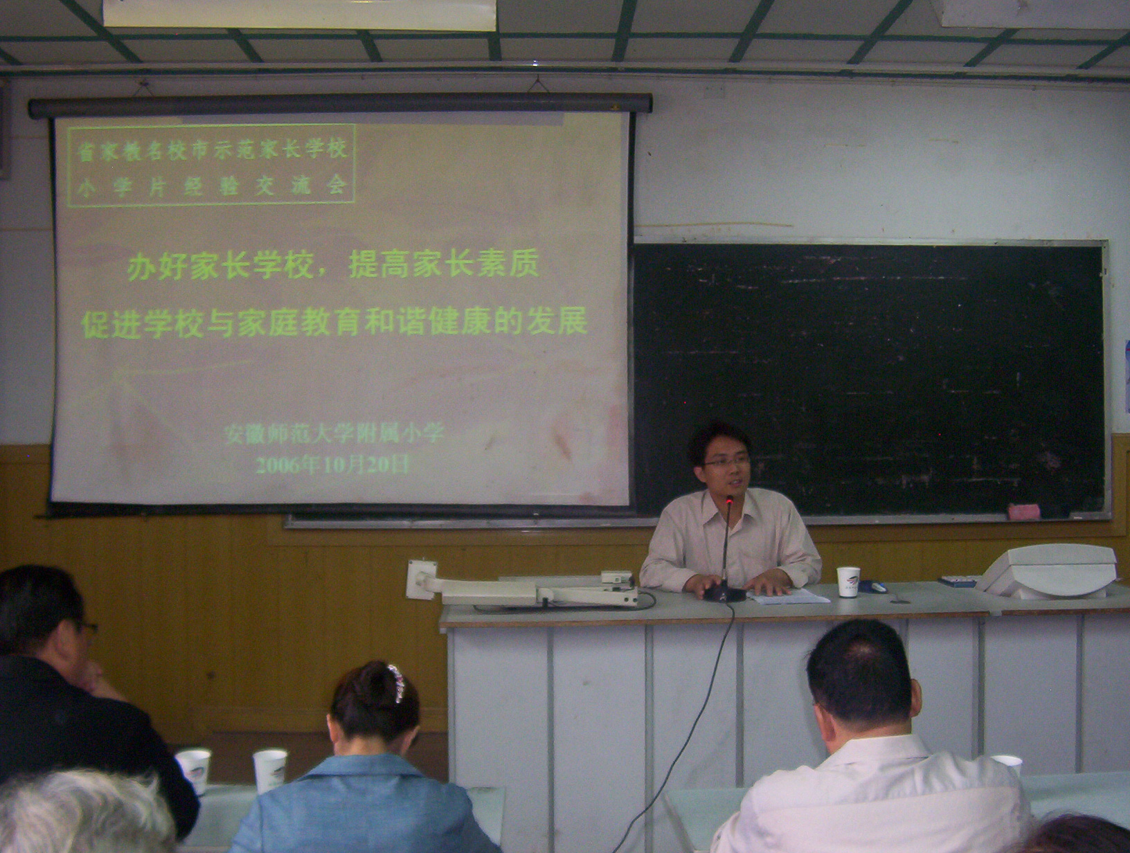 10月20日上午,“省家教名校、市示范家长学校小学片经验交流会”在我校多媒体教室召开,会议由市教育局关工委葛友华主任主持,我校费太秀书记和骆正位主任参加了会议。会议由三部分组成,首先是示范学校代表发言。骆正位主任代表我校做了《办好家长学校,提高家长素质,促进学校与家庭教育和谐健康的发展》的报告,镜湖小学、鸠江区美的希望小学、王家巷小学也分别派了代表发言;其次是繁昌县教育局杨柳副局长做了关于《现代家庭教育教材》的讲座;最后市教育局关工委葛友华主任做了会议总结。