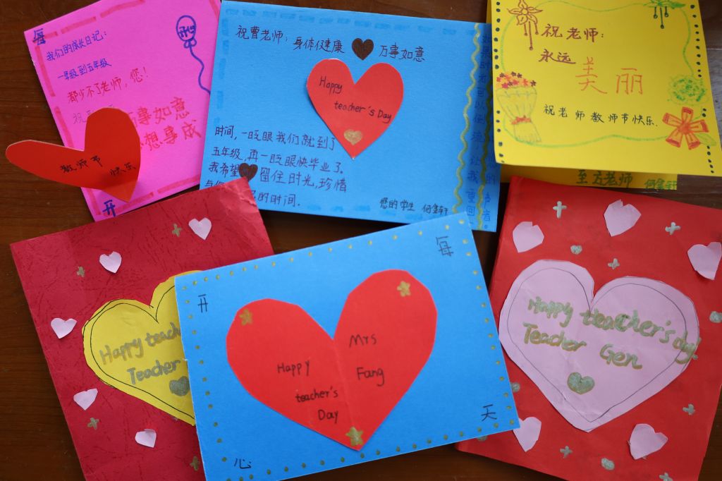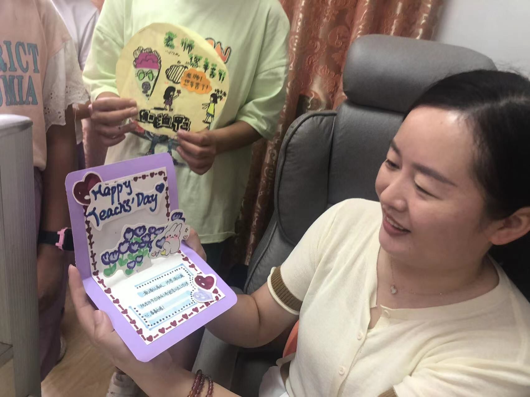 9月9日,两校区各年级部分学生代表还向老师们送上自己制作的手工作品。老师们脸上露出了幸福、灿烂的笑容。美术组的老师们还挑选了部分优秀作品,布置了学校创意园。校园里洋溢着喜悦、感恩与祝福……
