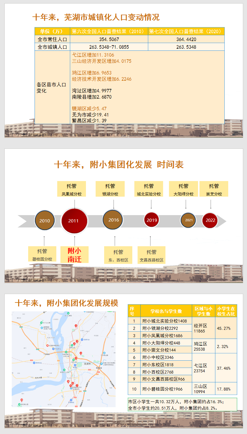 时代是出卷人。辛治洋在报告中指出,过去十年是芜湖市城镇化进程最快的时期。2021年芜湖城镇化率为73.0%,比全国的城镇化率高出近10个百分点,达到高度城镇化水平。城镇化是现代化的必由之路,是包括优质教育在内的公共服务供给能力的提升过程。以2010年托管碧桂园分校开始,尤其是以2011年从中心城区镜湖区南迁至弋江区为标志,十来年,安师大附小紧跟芜湖市城镇化人口流动方向,从一所学校变成十个分校(校区),从24个班变成261个班,从1200名学生变成16827名学生。目前,芜湖市区每1000名小学生中,就有163名来自安师大附小及其旗下的合作学校。附小的集团化办学有力地推动了芜湖市新型城镇化的进程,在芜湖,给新时代出卷人交上了一份满意的答卷。