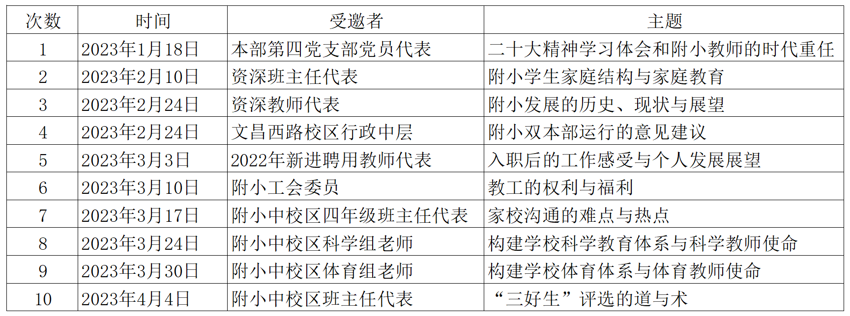“校长下午茶”是附小党委贯彻落实《关于在全党大兴调查研究的工作方案》的实际行动,是转变工作作风、密切联系群众、提高履职本领、强化责任担当的重要举措。自今年1月以来,“校长下午茶”活动已经连续开展了十期,先后与51位教师座谈,取得了良好的实际效果和社会效应。